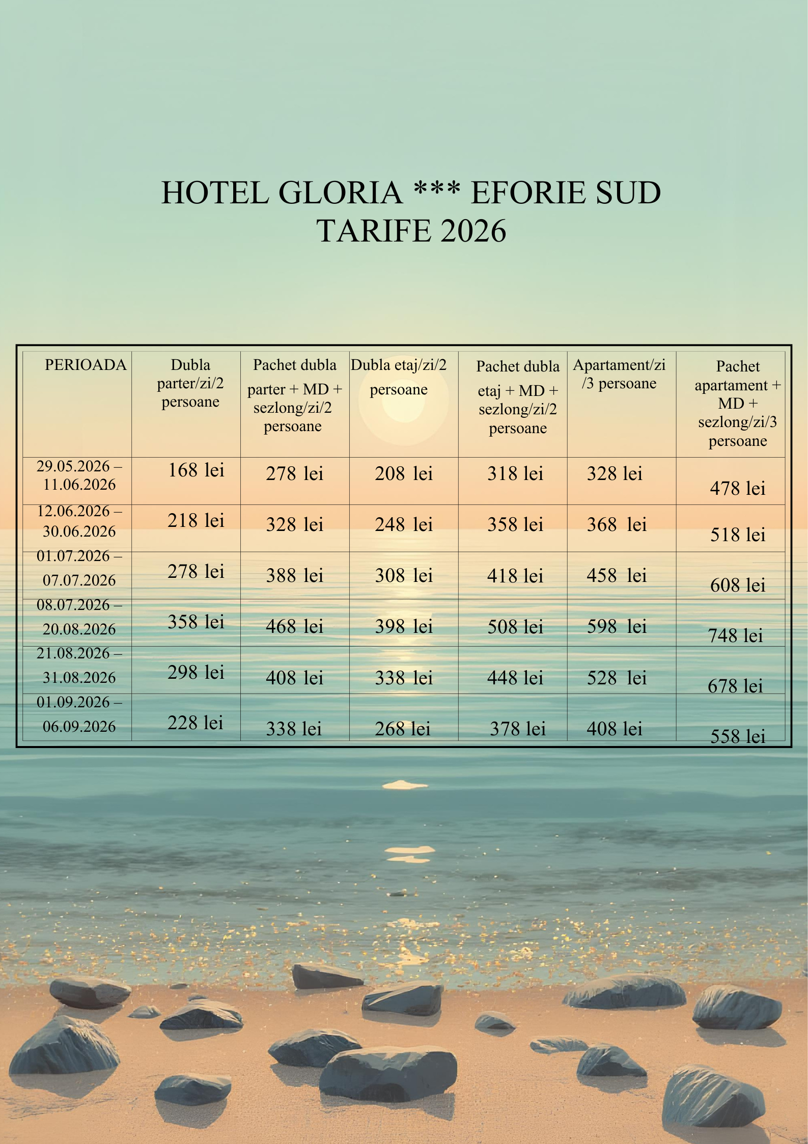 - Închiriere șezlong pe plaja privată: 25 lei/zi/persoană.